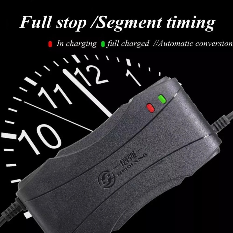 Este carregador possui sistema de carregamento inteligente com corte automático quando a bateria atinge a carga completa, garantindo maior segurança, durabilidade e proteção contra sobrecarga.