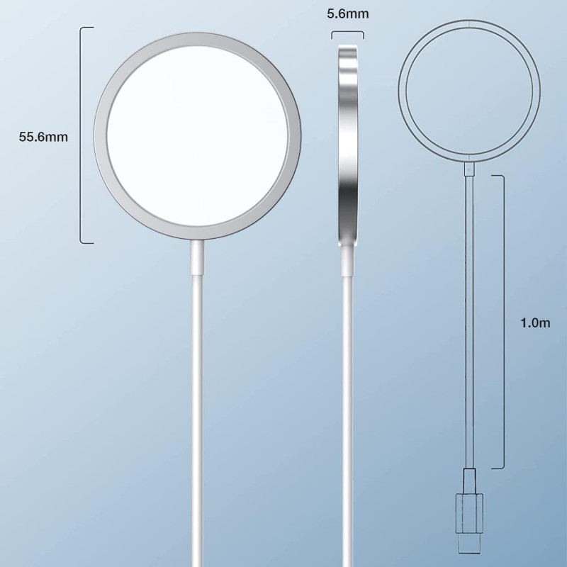 Com um tamanho muito compacto de 58,5 mm de diâmetro e 6,2 mm de espessura, este carregador é extremamente portátil, perfeito para viagens.