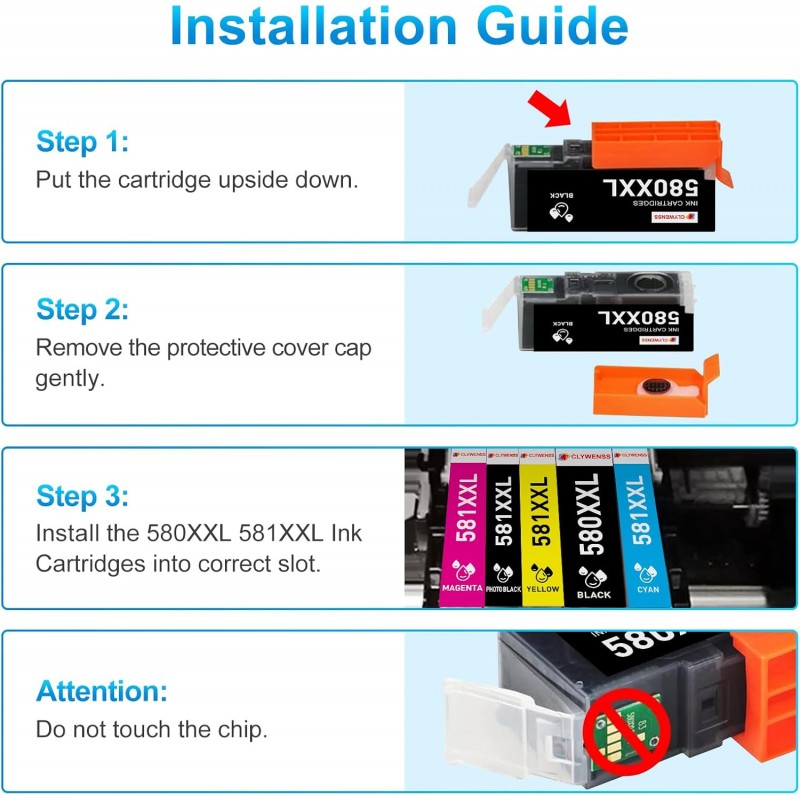 Conjunto de cartuchos de tinta compatíveis Canon, modelo PGI 580XXL e CLI 581XXL. Pack ideal para substituir todos os cartuchos principais da sua impressora, garantindo textos nítidos, cores vivas e compatibilidade estável.