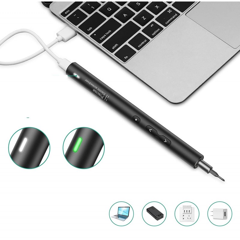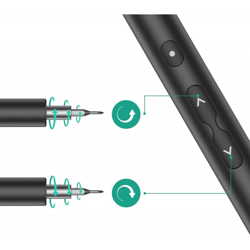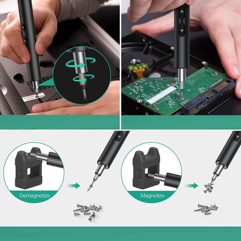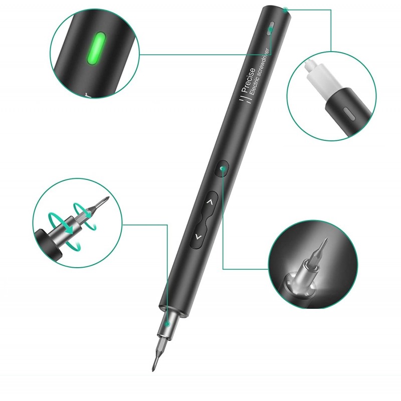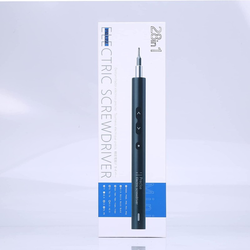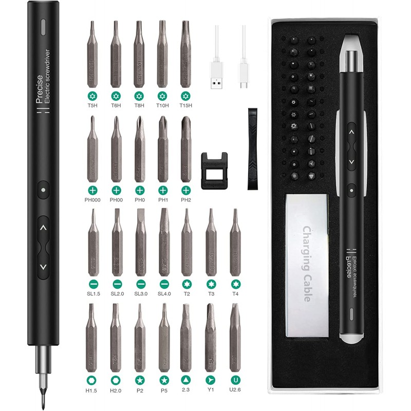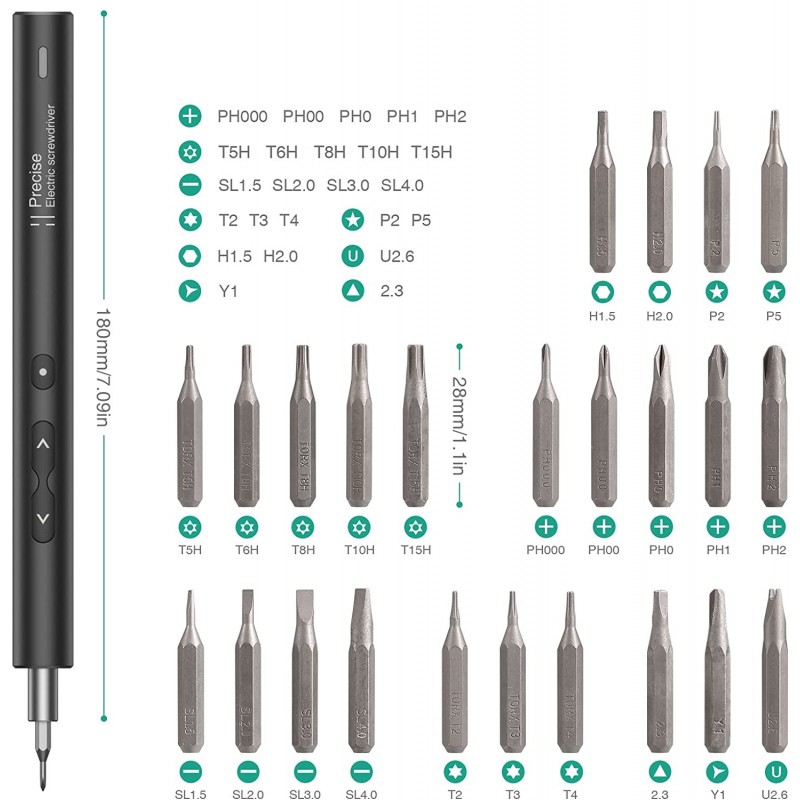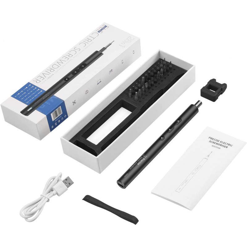 O conjunto de chaves de fenda inclui 24 pontas especiais de precisão, uma alça de chave de fenda elétrica, um cabo de carregamento USB, um magnetizador e uma caixa de embalagem portátil.