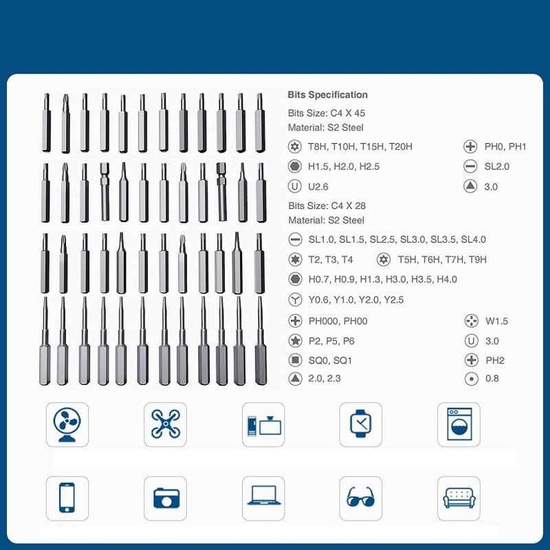 Este conjunto é amplamente aplicável e inclui 48 pontas de precisão, um bloco de mesa de trabalho magnético, uma ventosa, um calcador de depilar e muito mais.