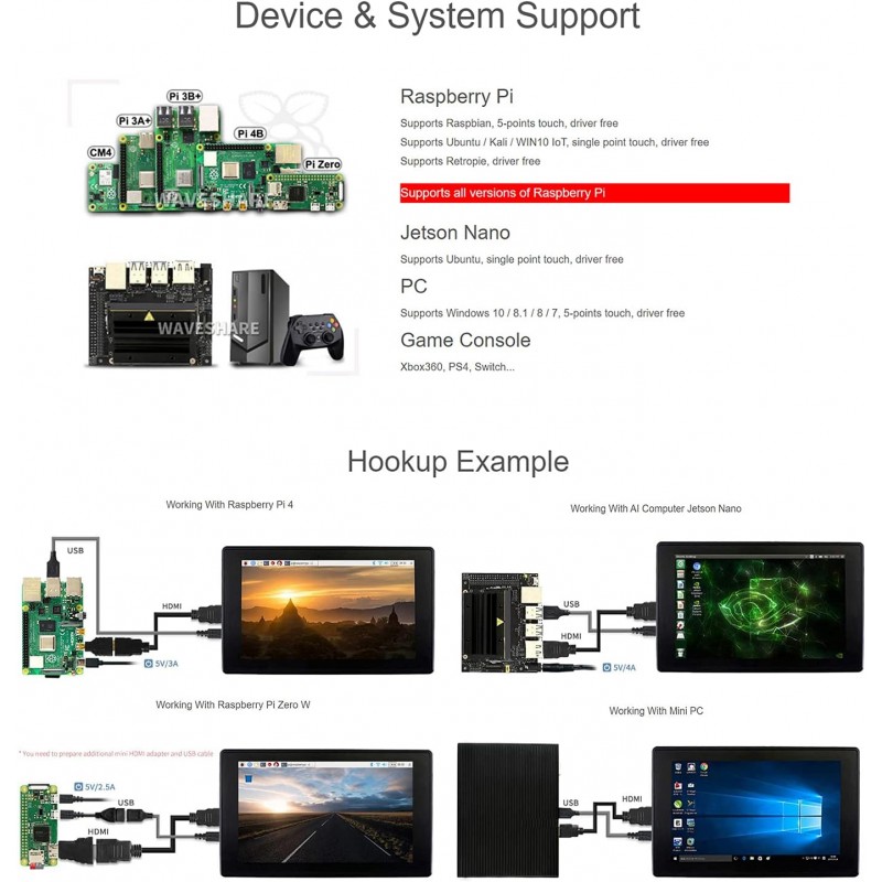 Ecrã tátil capacitivo de 7 polegadas com resolução de 1024x600, tecnologia IPS e estojo protetor. Compatível com Raspberry Pi, Jetson Nano, Windows, consolas e outros dispositivos. Inclui todos os acessórios necessários para uma instalação simples e funcional.