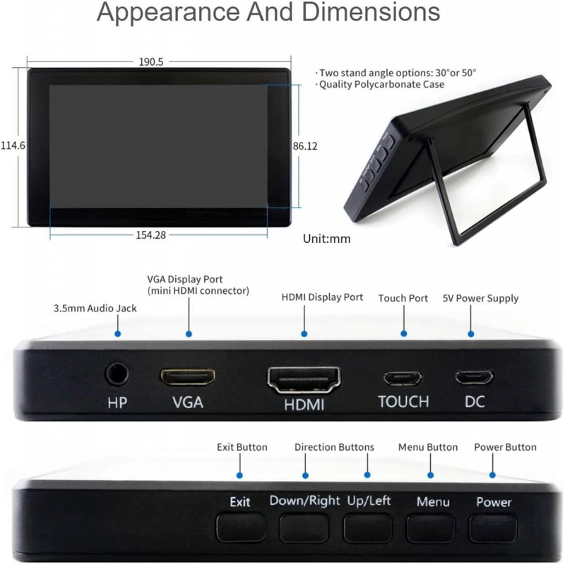 Ecrã tátil capacitivo de 7 polegadas com tecnologia IPS, resolução de 1024x600, proporção de 16:9 e vidro temperado, oferecendo imagens nítidas e um excelente desempenho visual. Ideal para Raspberry Pi, Jetson Nano, PCs, consolas de jogos e outros dispositivos compatíveis.