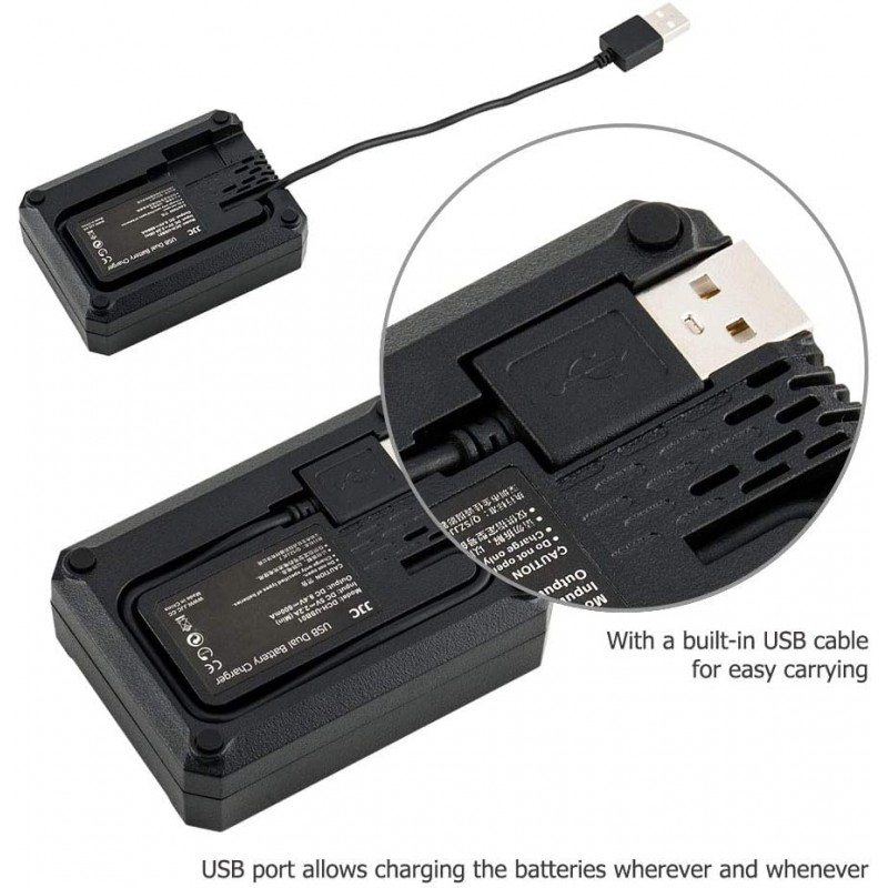 Carregador USB duplo com cabo integrado, ideal para carregar até 2 baterias DMW-BLG10 ou BP-DC15 em simultâneo. Compatível com câmaras Panasonic e Leica. Compacto, portátil e com proteção contra sobreaquecimento e sobrecarga.