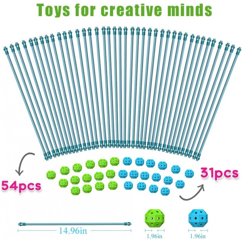 Kit de construção para crianças com 85 peças que brilham no escuro, perfeito para criar castelos, foguetões e muito mais. Inclui rótulas e hastes resistentes.
