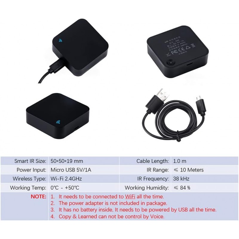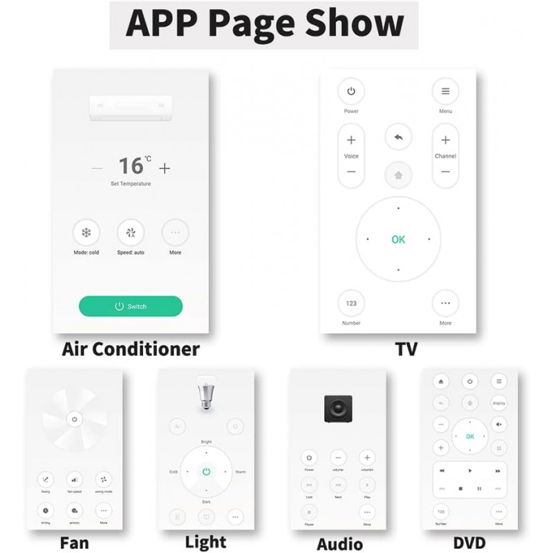O controlo remoto universal por infravermelhos com ligação Wi-Fi de 2,4 GHz permite controlar vários eletrodomésticos à distância, diretamente a partir do seu smartphone através da aplicação "Tuya Smart" ou "Smart Life". Compatível com comandos de TV, ar condicionado, DVD, ventilador, entre outros, funciona com a maioria das marcas disponíveis no mercado.