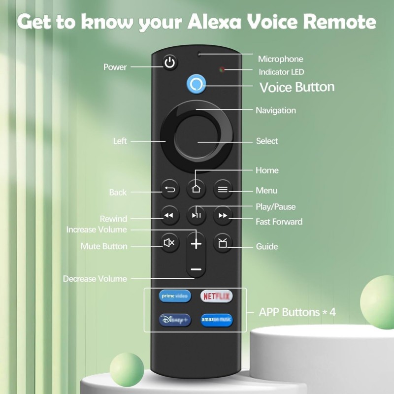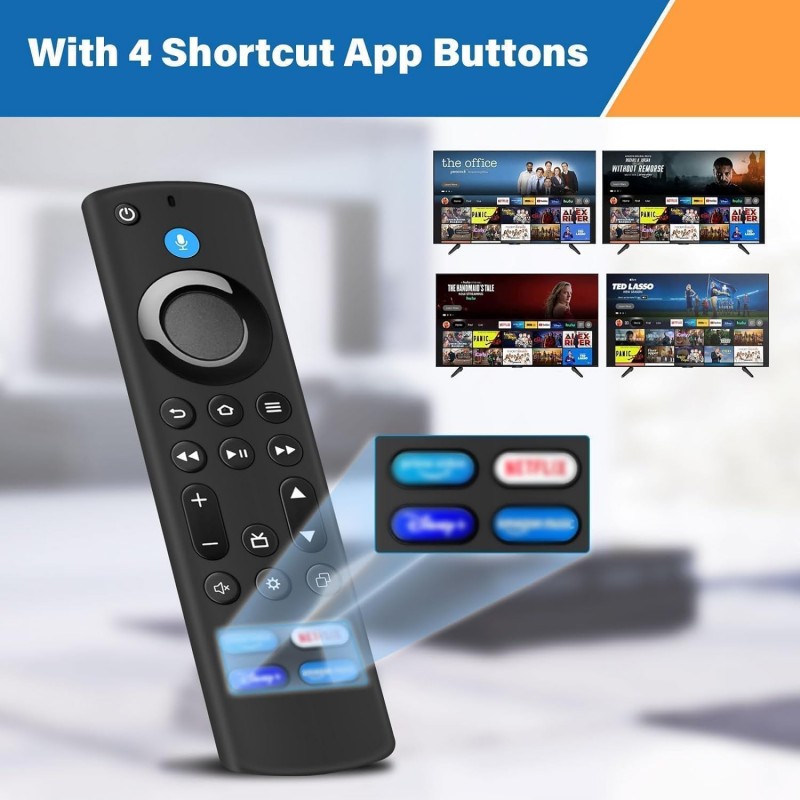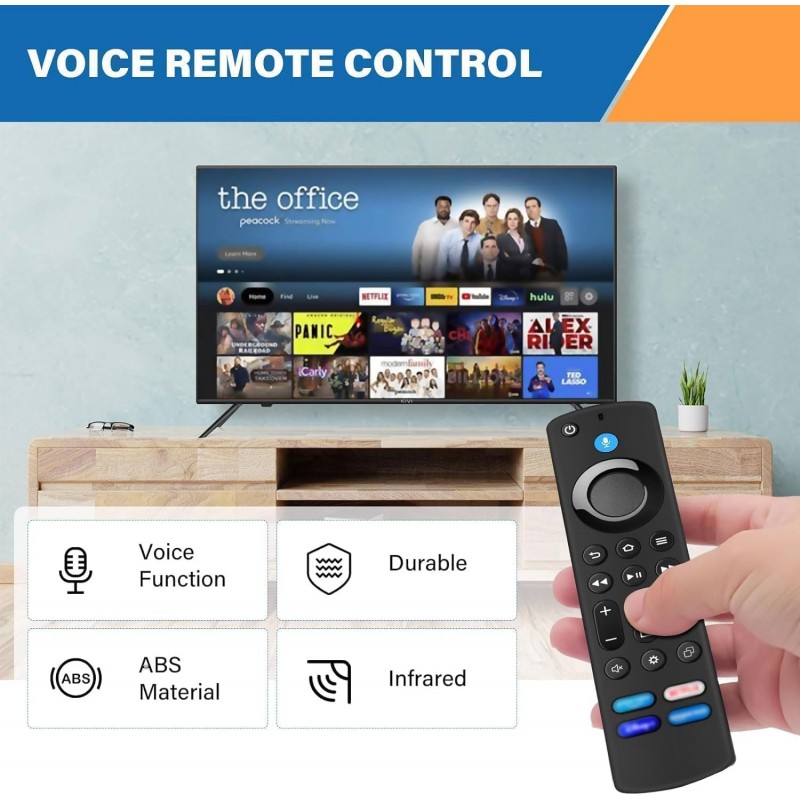 Controlo remoto de substituição com função de voz, compatível com televisores inteligentes A MZ incluindo modelos 4K, 4K Max, Lite e Cube Stick. Suporta pesquisa por voz, oferece navegação rápida com botões dedicados e utiliza tecnologia infravermelha com alcance até 10 metros. Fácil de emparelhar e ideal para substituir o comando original.