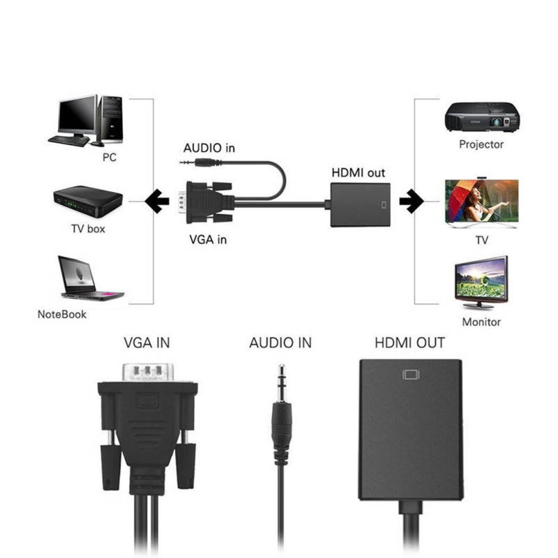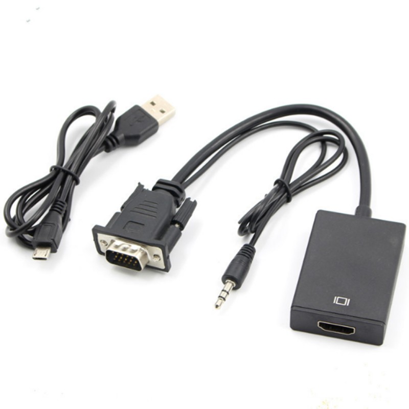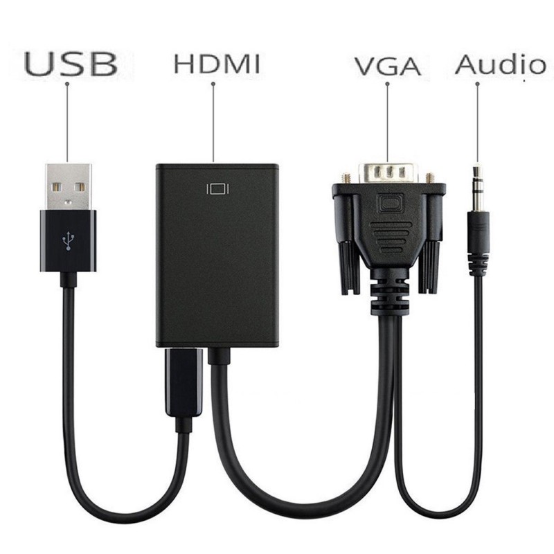 Cabo Adaptador VGA para HDMI com Áudio. Este conversor incorpora de um lado um conector VGA macho no outro um conector HDMI fêmea. O cabo conversor mede cerca de 30 cm. Tem um cabo adicional de 80 cm de microUSB para USB para alimentar a conversão e um cabo jack 3.5 macho para injectar o áudio. Resolução HDMI até 1080P/60HZ