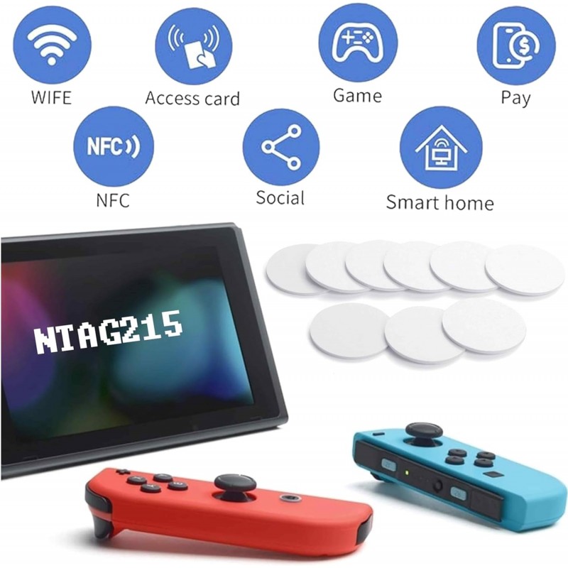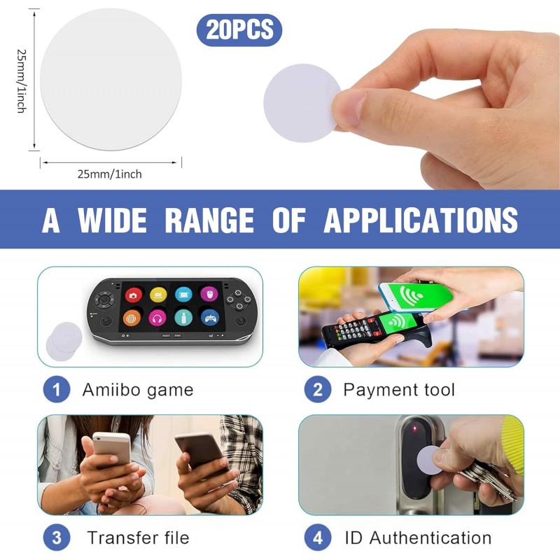 Pack de 20 etiquetas NFC e cartões NFC regraváveis com memória de 504 bytes. Compatível com iPhone e TagMo. Fácil de usar e feito de material PVC durável, com adesivo para fixação.