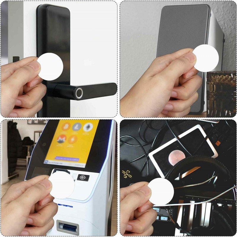 Estas etiquetas NFC são feitas de material PVC durável, garantindo uma longa vida útil e resistência ao desgaste. O formato redondo de 25 mm de diâmetro facilita a aplicação em diversas superfícies, e o adesivo na parte traseira permite uma fixação segura e prática.