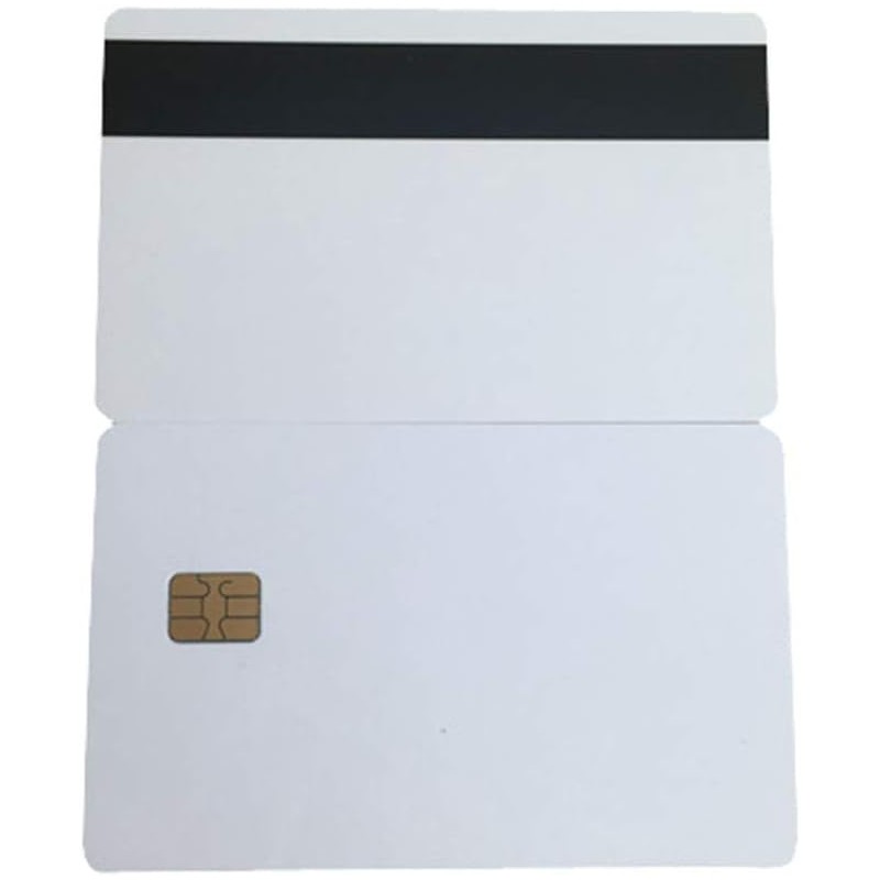 Pacote de 10 cartões inteligentes em PVC branco, com chip SLE4442 e banda magnética Hico. Ideal para personalização e uso em sistemas de segurança, com tamanho padrão de cartão de crédito.