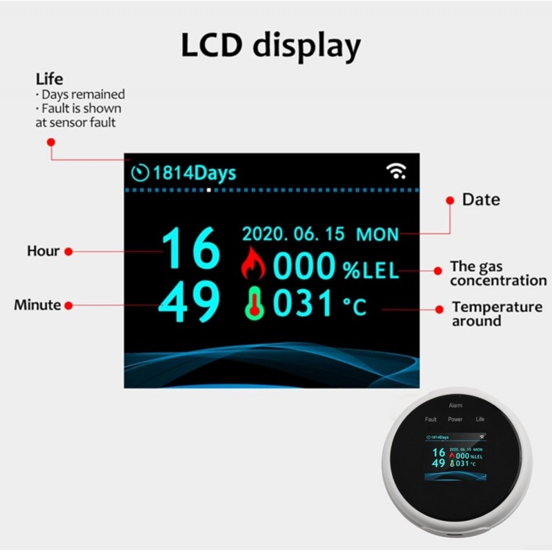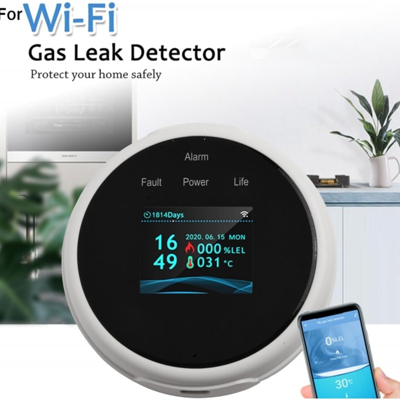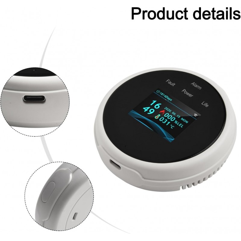 Detetor de gás natural com ecrã LCD claro, alarme sonoro e conectividade WiFi Tuya. Monitoriza fugas de gás, temperatura ambiente e inclui funcionalidades inteligentes para maior segurança em casa.