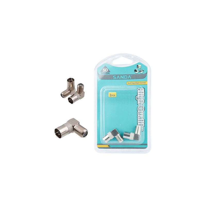 Adaptadores coaxiais RF em formato L com entrada fêmea, ideais para ligações de antena em espaços reduzidos. Pack com 2 unidades.