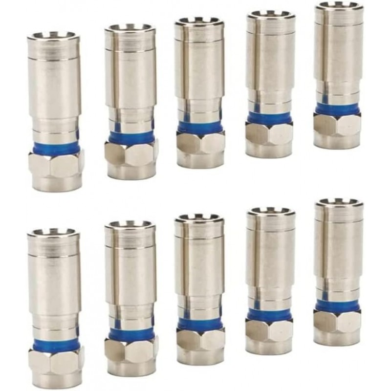 Conjunto de 10 conectores de compressão F de montagem rápida, fabricados em metal resistente à corrosão, especialmente indicados para ligação de cabos coaxiais em instalações de televisão, satélite e sistemas de receção digital.