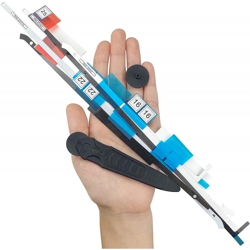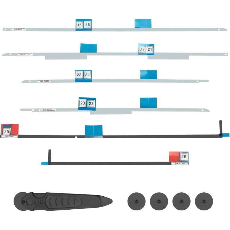 Cada fita está claramente identificada, facilitando a aplicação correta durante a substituição do ecrã. O kit de abertura incluído torna o processo de reparação mais fácil e eficiente.