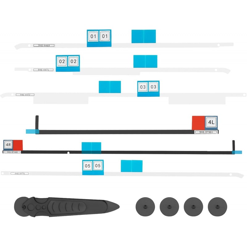 Cada uma das fitas encontra-se devidamente etiquetada para facilitar a aplicação correta durante o processo de substituição. Este kit inclui ainda uma ferramenta com roda de abertura, acompanhada de 5 cartuchos de substituição, permitindo remover o ecrã com segurança sem danificar a estrutura do equipamento.