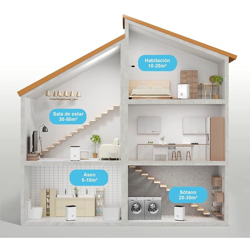 Ideal para espaços até 50m² ou 100m³, como casas de banho, porões, lavandarias, cozinhas e quartos, este aparelho oferece uma solução eficiente e eco-friendly.