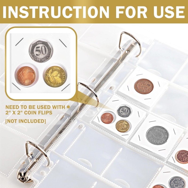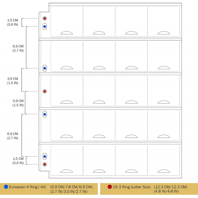 Cada folha possui 20 bolsos com medidas de 54 x 52 mm, adequadas para acomodar coin flips de 50 x 50 mm, permitindo um ajuste seguro e visualização completa da frente e verso das moedas.