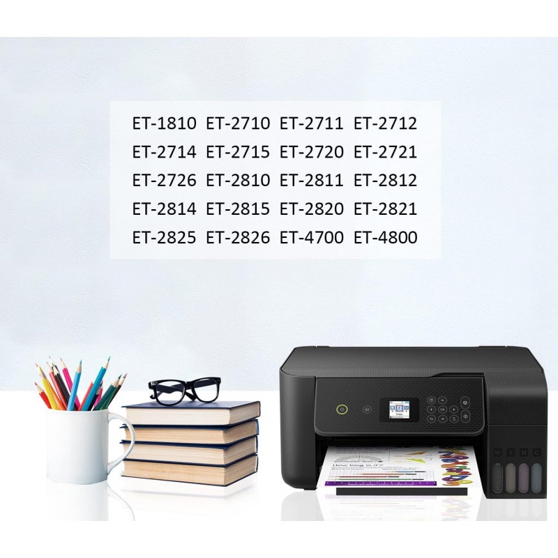 Este conjunto de tintas é compatível com uma ampla gama de impressoras Epson EcoTank, incluindo os modelos ET-1810, ET-2710, ET-2711, ET-2712, ET-2714, ET-2715, ET-2720, ET-2721, ET-2726, ET-2810, ET-2811, ET-2812, ET-2814, ET-2815, ET-2820, ET-2821, ET-2825, ET-2826, ET-4700 e ET-4800, garantindo uma integração perfeita com o seu equipamento.
