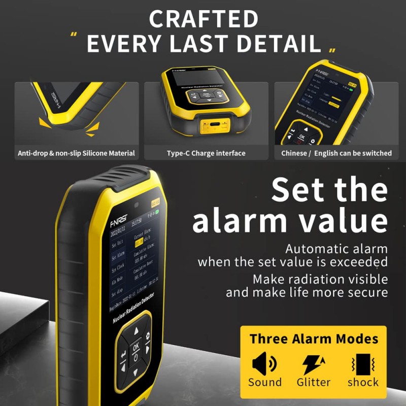 A estrutura do dispositivo é feita com uma capa de silicone antiderrapante, resistente ao desgaste e com um design ergonómico, garantindo conforto e durabilidade no uso. Este contador Geiger é ideal para monitorização de ambientes como laboratórios, áreas industriais e outros locais onde é necessário controlar a radiação.