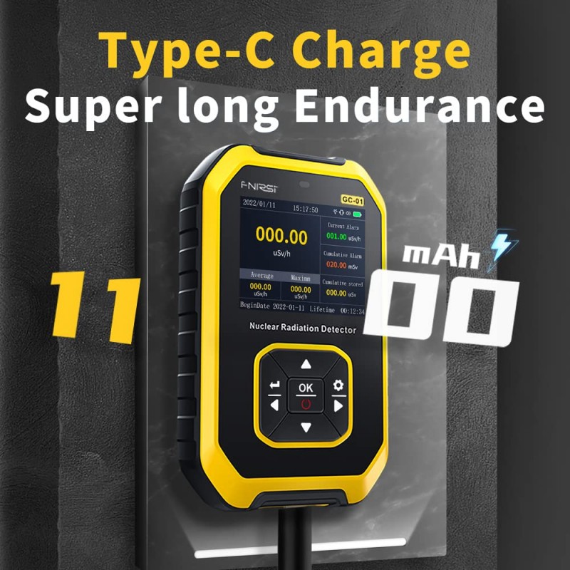 Contador Geiger de alta sensibilidade com ecrã LCD colorido para monitorização de radiação nuclear. Equipado com bateria de lítio recarregável de 1100 mAh, deteta raios X e GZRD em tempo real, ideal para uso em laboratórios e ambientes industriais.