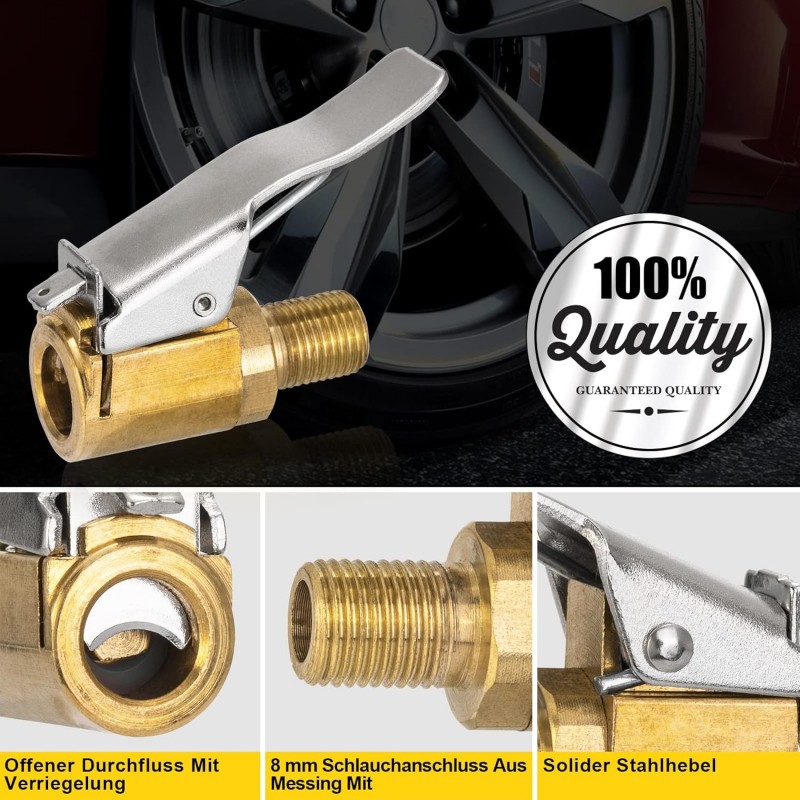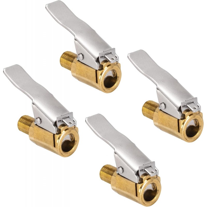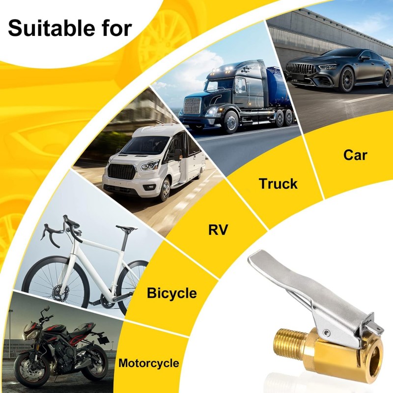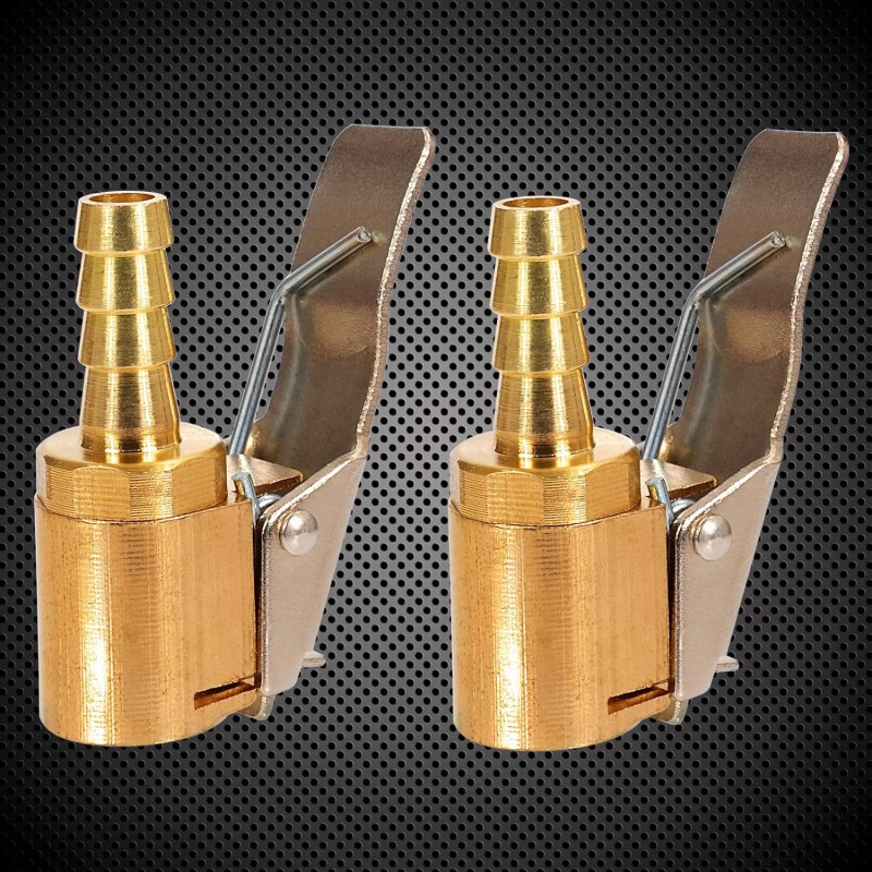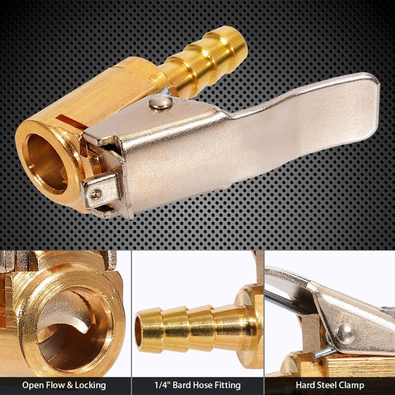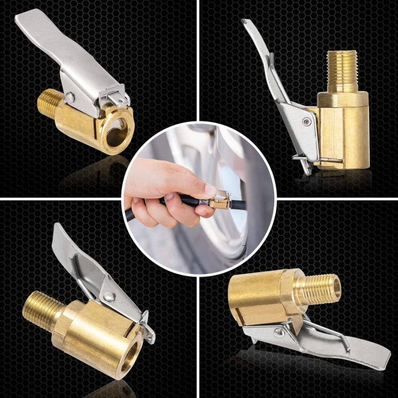 Kit de bicos insufladores de latão, disponíveis em várias medidas, com válvula de braçadeira. Ideal para insuflar pneus de carros, camiões e outros veículos. Construção durável em latão maciço com resistência à corrosão e pressão máxima de 150 psi.