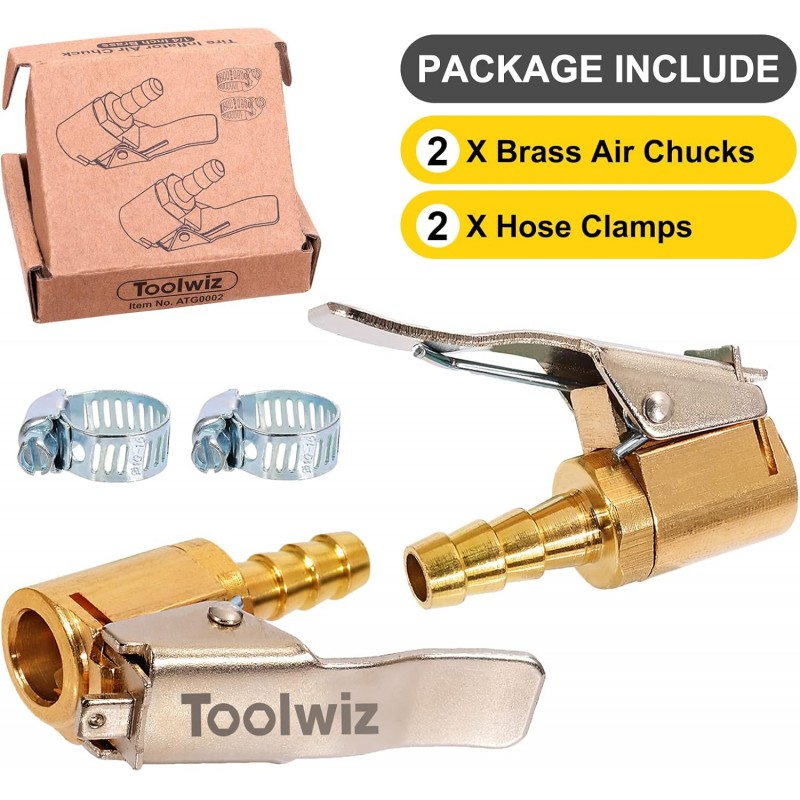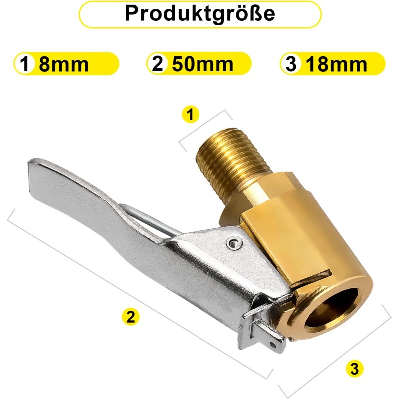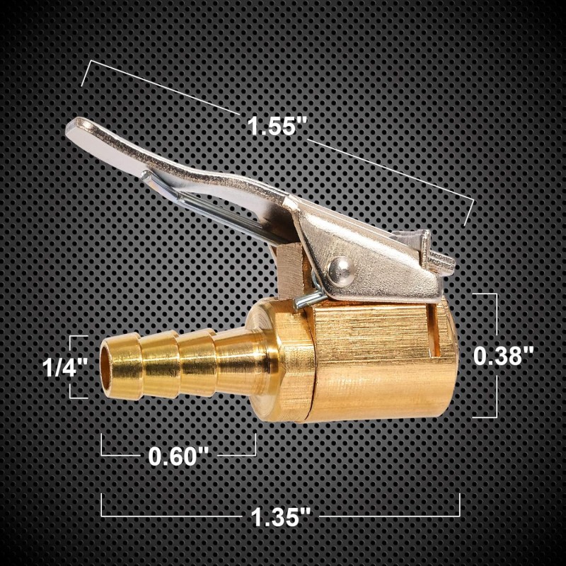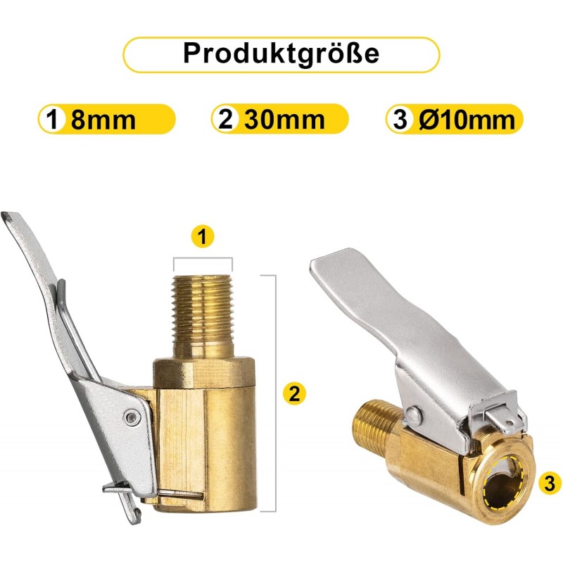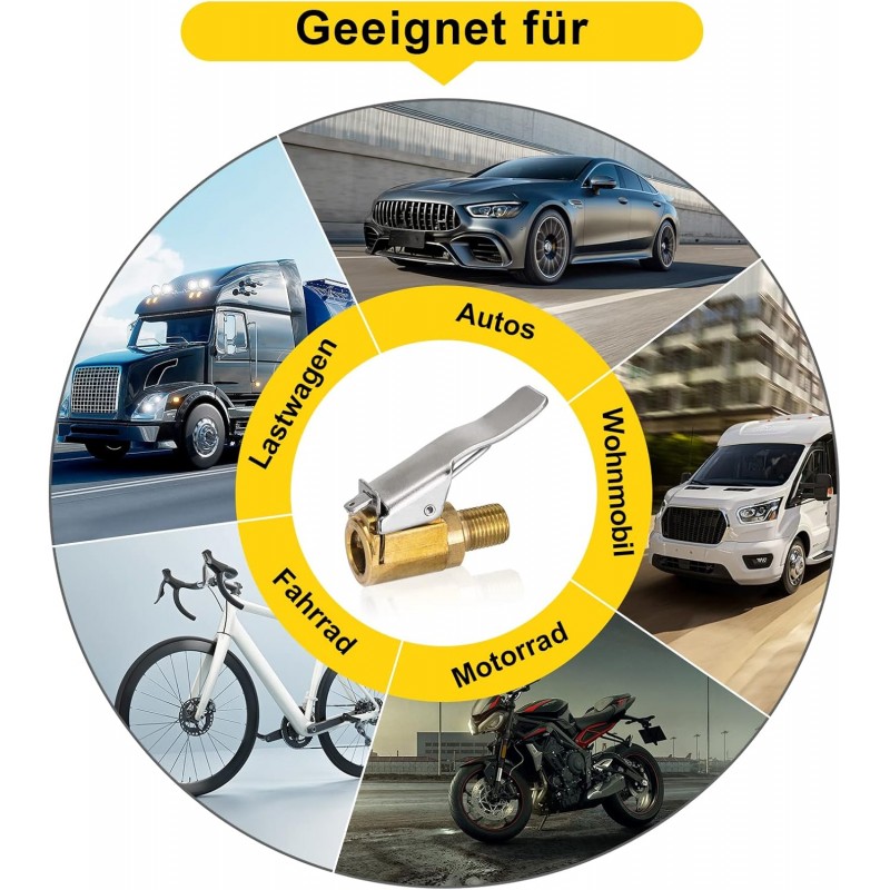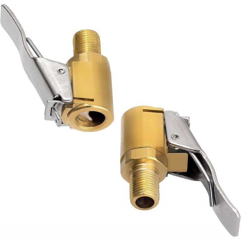 Kit de bicos insufladores de latão, disponíveis em várias medidas, com válvula de braçadeira. Ideal para insuflar pneus de carros, camiões e outros veículos. Construção durável em latão maciço com resistência à corrosão e pressão máxima de 150 psi.