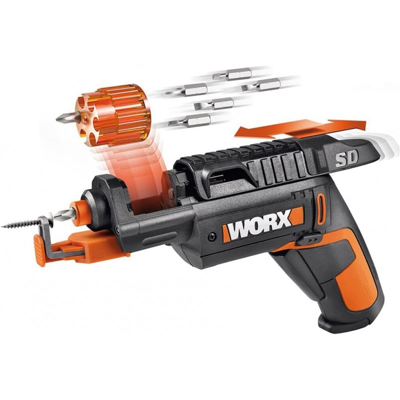 Mudança Automática de Pontas: Equipada com um tambor de 6 pontas intercambiáveis, esta parafusadora permite mudar de ponta de forma rápida e eficiente apenas deslizando a tampa para trás.