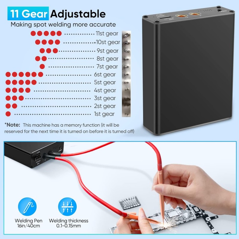 Equipado com 11 níveis de potência ajustáveis, este soldador por pontos oferece precisão inigualável.