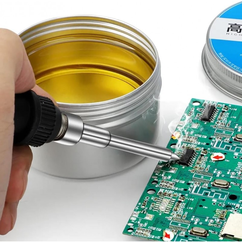 Uso Especializado em Eletrónica: Ideal para soldar componentes em circuitos impressos (PCB). A pasta pode ser aplicada nos pontos de soldagem necessários, e os componentes são colocados em cima, sendo o processo de soldagem geralmente concluído com calor.