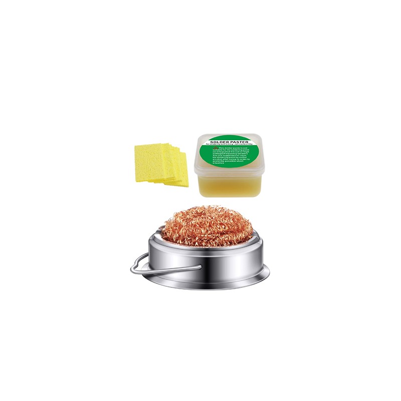 Bola e Base de Limpeza de Pontas de Soldagem: Uma solução eficiente para limpar a ponta do soldador, feita de aço inoxidável resistente ao calor. A bola de esponja de arame de latão dispensa o uso de água, protegendo a ponta do soldador da oxidação.