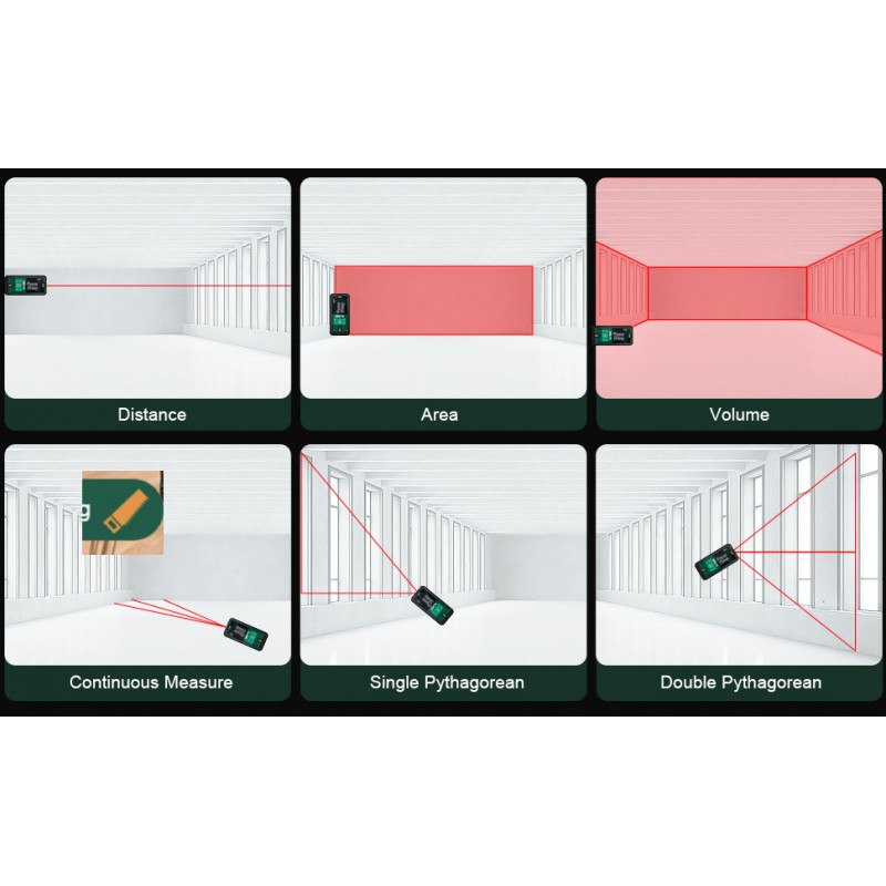 Ideal para medir comprimentos, larguras, alturas e volumes em quartos, apartamentos, edifícios, terrenos, fábricas e armazéns.