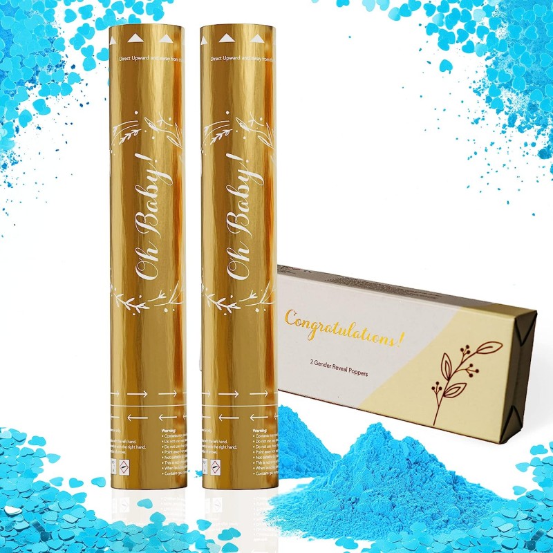 Este conjunto inclui dois canhões de confetes azuis e dois autocolantes pretos para cobrir a etiqueta de cor na parte inferior do canhão, garantindo a surpresa até o último momento.