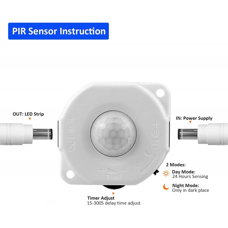 Modo dia: Detecção em 24 horas, as luzes acenderão/apagam-se automaticamente quando detetar o movimento. Devemos ajustar o comando ao ícone do sol. Modo noturno: Funciona apenas à noite ou em locais muito escuros, a luz ambiente afetará a deteção do sensor. Devemos ajustar o comando à Lua ÍCON.