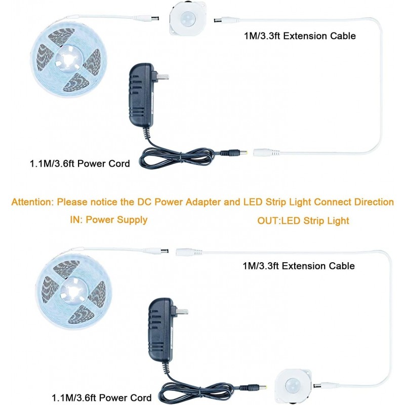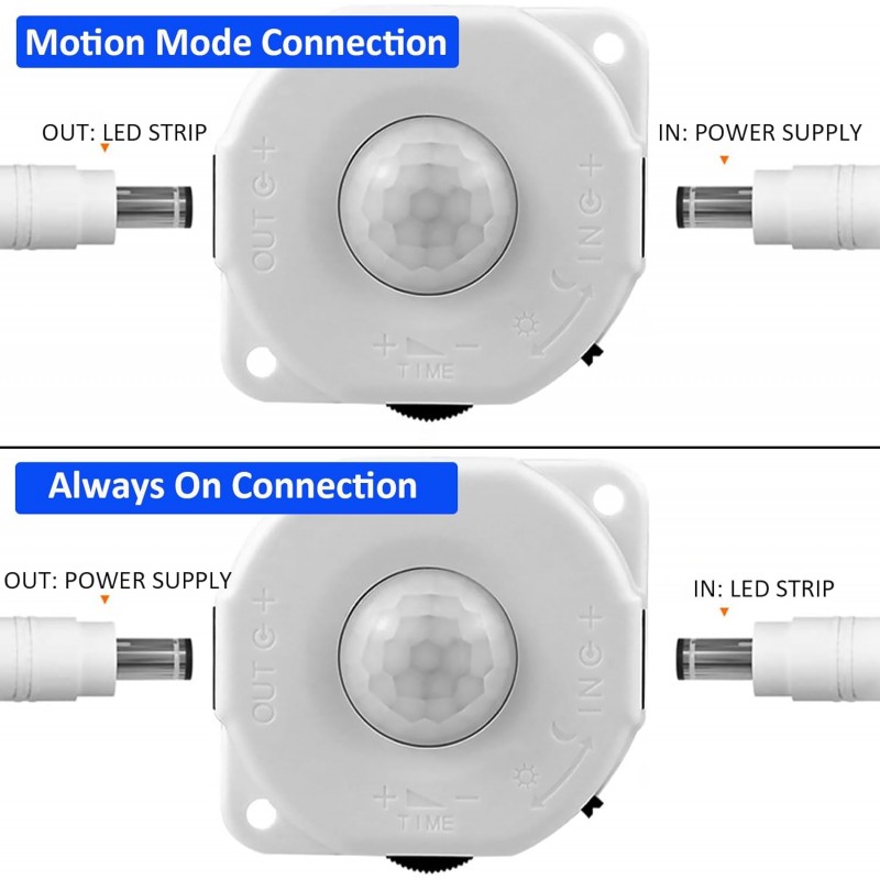 Invertendo a conexão, a porta IN conecta a tira de LED e a porta OUT conecta o adaptador de 12 V, o sensor não funcionará, e a tira de luz estará sempre acesa.