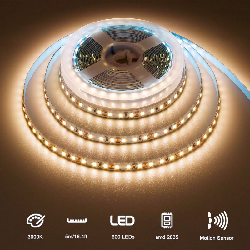 Tira LED de 5 metros com sensor de movimento PIR, 320 LEDs/m, cor branco quente 3000K. Flexível, recortável e fácil de instalar, ideal para iluminação interior.