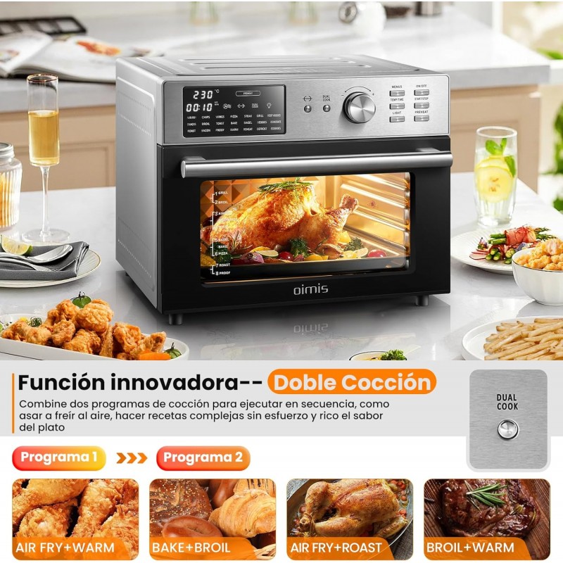 Marca OIMIS Cor Prata Dimensões do produto 43,4P x 46L x 37,5A centímetros Funcionalidade especial Termostato ajustável, cozimento duplo, Desligamento automático, assador superior, bandeja recolhe migalhas removíveis, armação ajustável, Função de grelha, grande capacidade, luz indicadora, menu aut