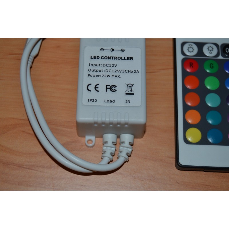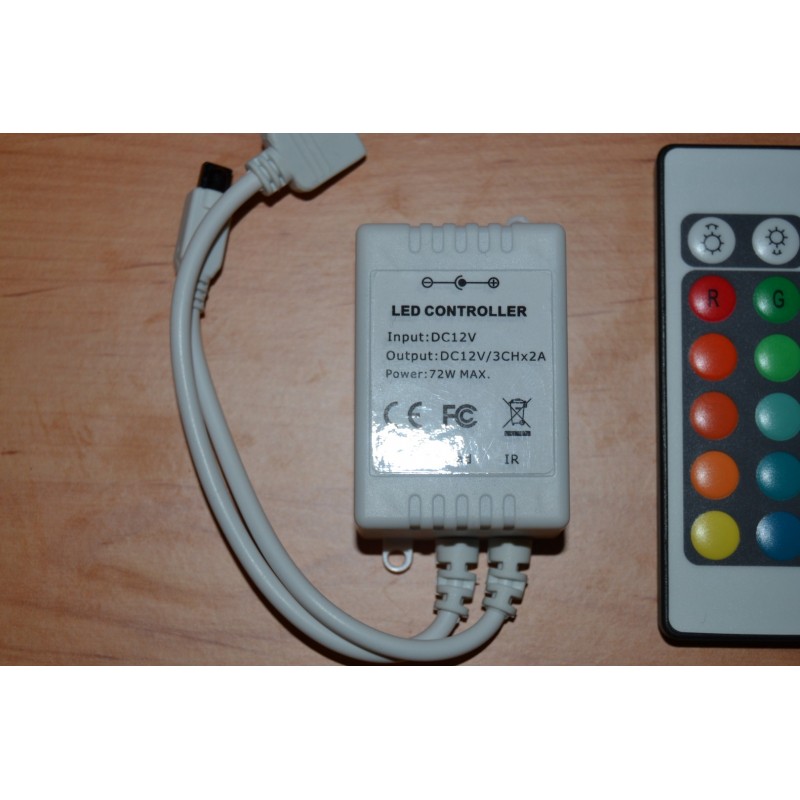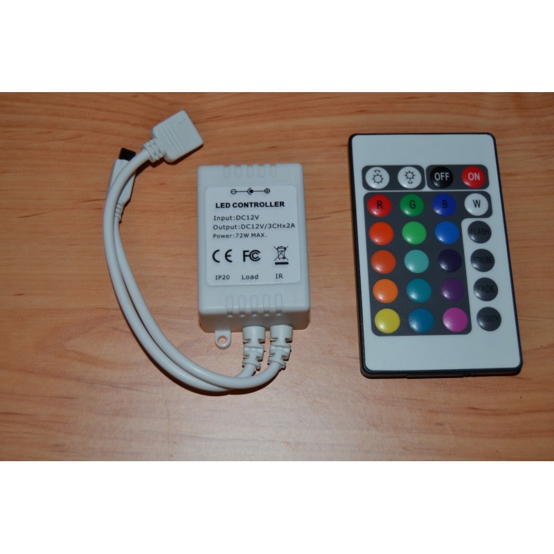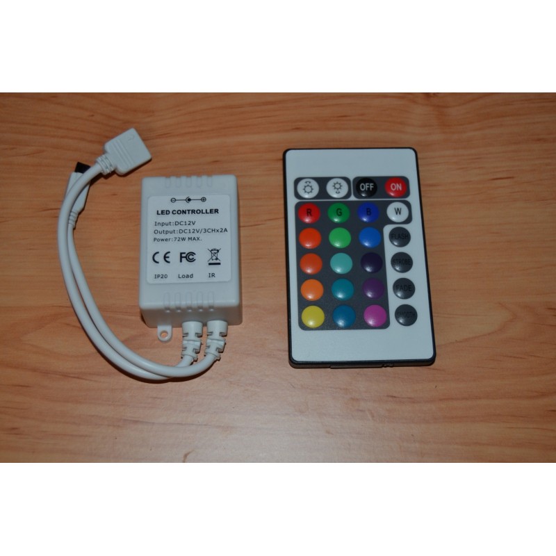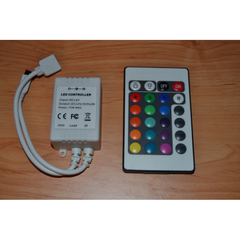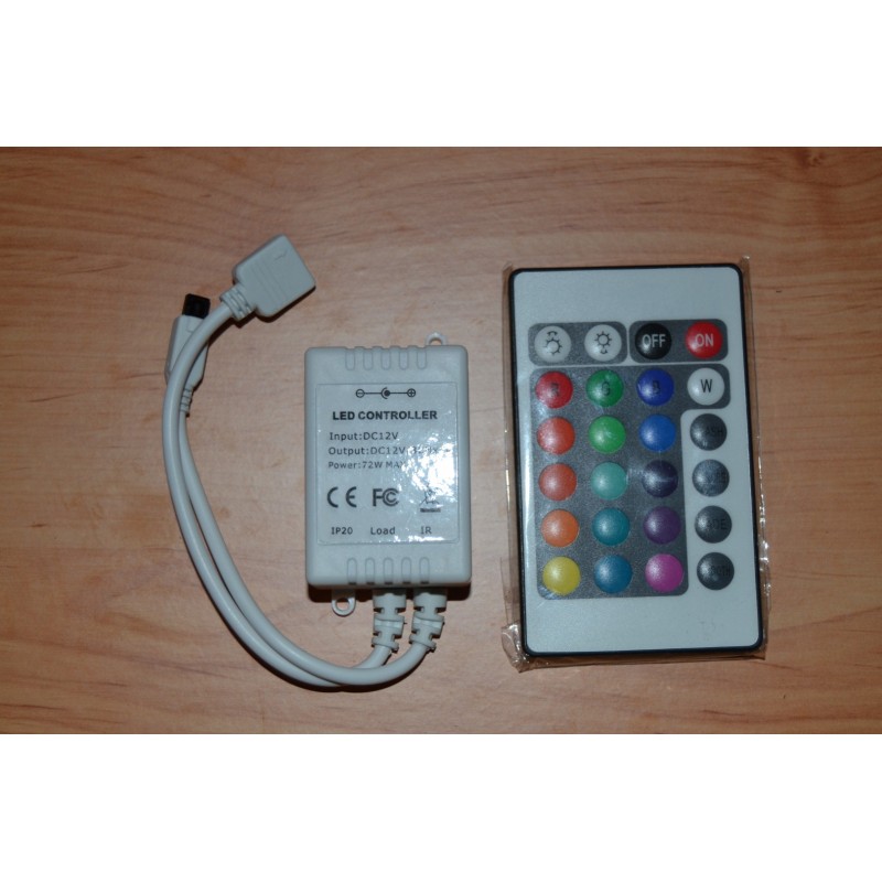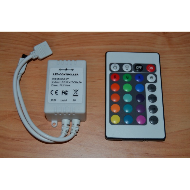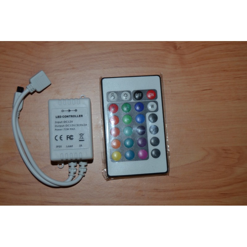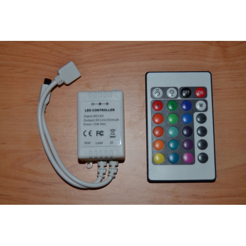 Comando para Fita LED RGB que permite controlar, de forma cómoda, rápida e intuitiva, todas as funções que apresentam as fitas, como: intensidade, côr ou efeitos de transições de côr. Além disso, também conta com modos de côr programados e personalizados. O produto inclui comando á distância por IR infravermelhos 24 botões e com 6 metros de alcance.