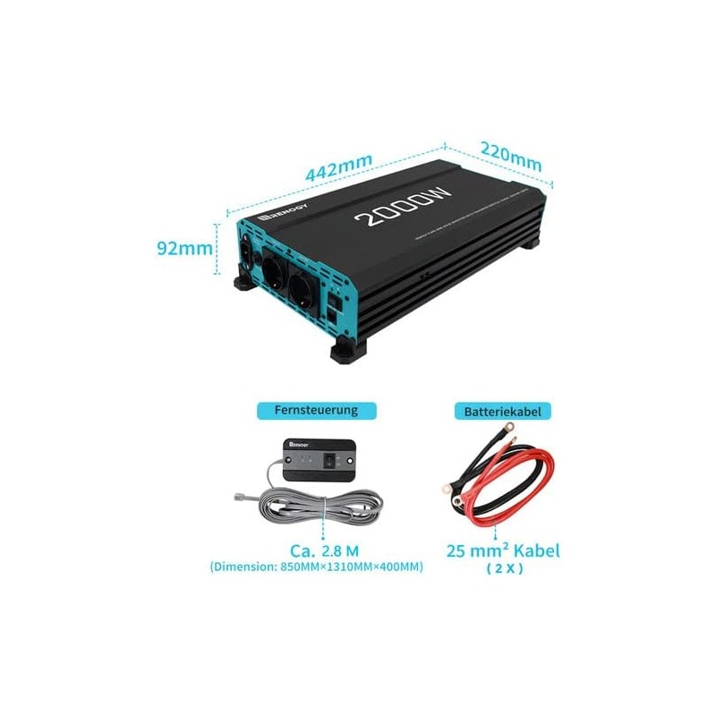 Com uma potência contínua de 2000W e pico de 4000W durante a partida de cargas, este inversor converte a energia de 12V CC para uma onda sinusoidal pura de 220-240V CA com maior eficiência de conversão, reduzindo perdas.