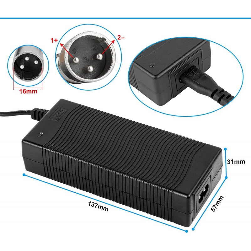 Compatível com dispositivos que possuem conectores XLR de 3 pinos, como motas elétricas, pequenos veículos elétricos de lítio, trotinetes elétricas, cadeiras de rodas elétricas, entre outros.