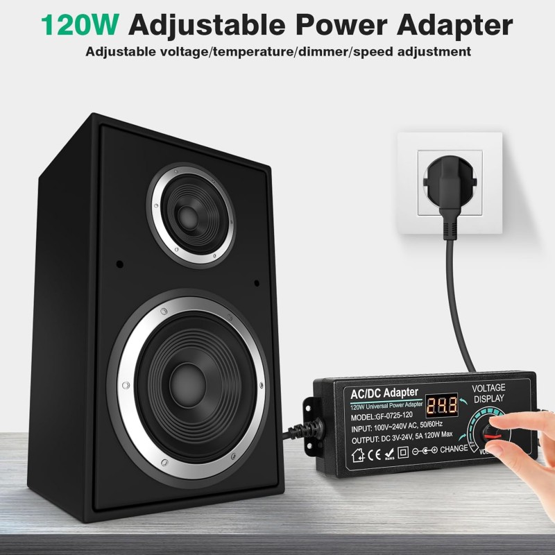 Este carregador universal portátil de 120W é perfeito para alimentar uma vasta gama de dispositivos eletrónicos, desde câmeras a altifalantes, com ajuste de voltagem entre 3V e 24V. Equipado com um botão giratório, pode ajustar facilmente a voltagem e o ecrã LED permite visualizar o valor da voltagem em tempo real. Fabricado com material ABS+PC, este adaptador oferece proteção contra sobretensão, sobrecorrente, curto-circuito e superaquecimento, garantindo um carregamento seguro e eficiente.