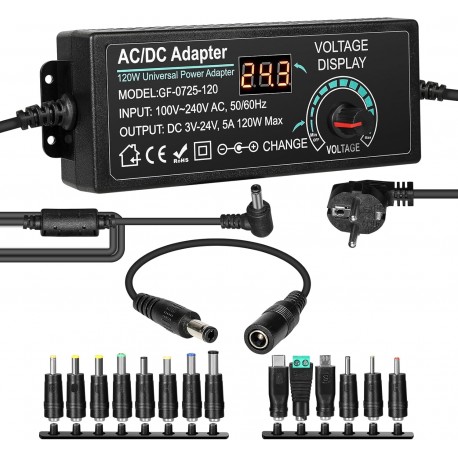 Adaptador de corrente ajustável: Entrada: 100 - 240 VAC, 50/60 Hz; a voltagem de saída pode ser ajustada de 3 V a 24 V DC; potência máxima: 5A 120W, o ecrã LCD mostra a voltagem de saída. O consumo de corrente não pode exceder 5 A, caso contrário, irá danificar a fonte de alimentação, por favor não sobrecarrege.