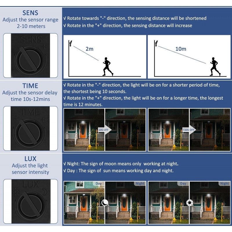 3 Modos de Sensor de Movimento: Equipado com modos ajustáveis SENS (distância de deteção 2-10m), TIME (tempo de atraso 10-180s) e LUX (dia/noite), permitindo personalização conforme a sua necessidade.
