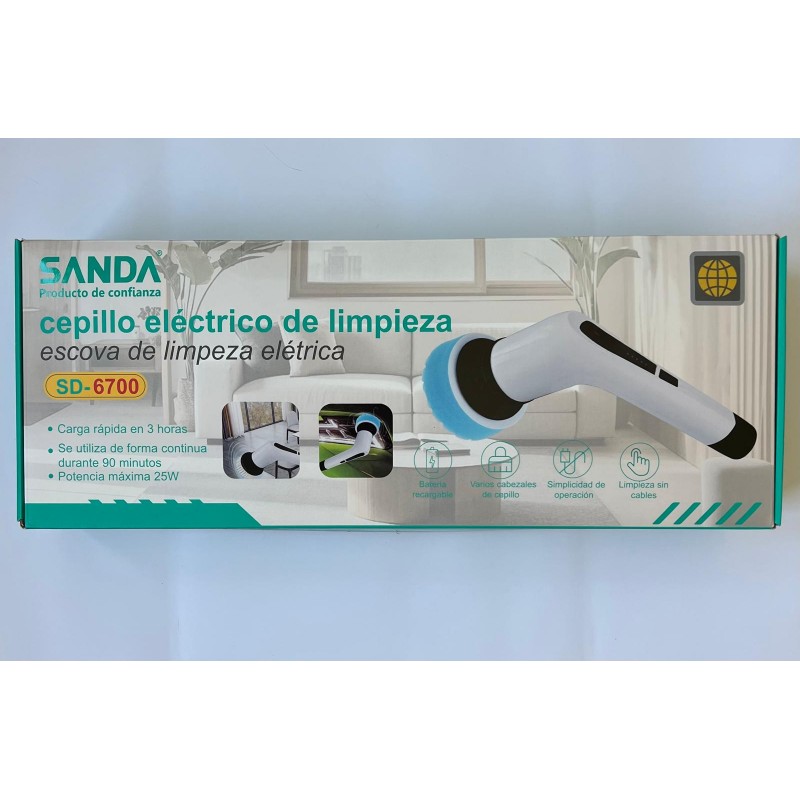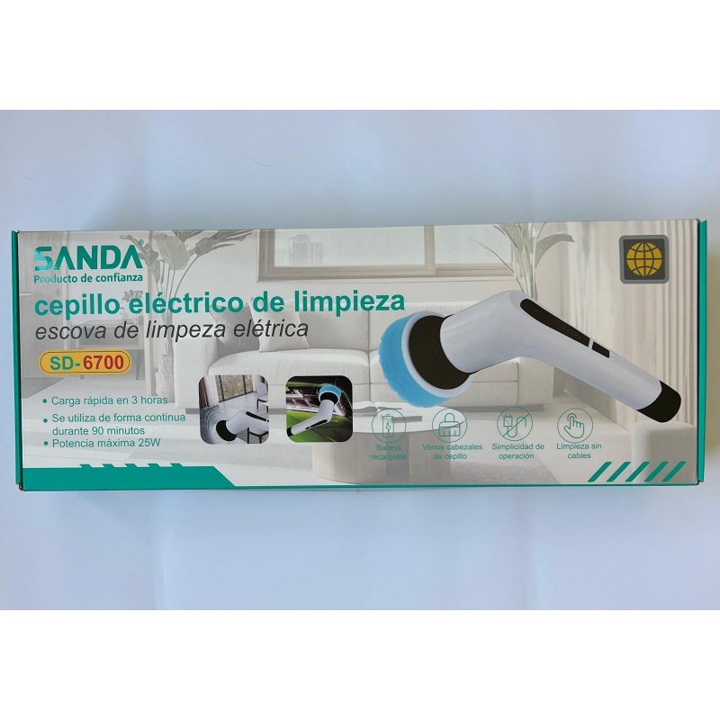 Escova elétrica de limpeza SANDA SD-6700, recarregável, com vários cabeçais de escova, potência máxima de 25W, até 90 minutos de utilização contínua e carregamento rápido em 3 horas.