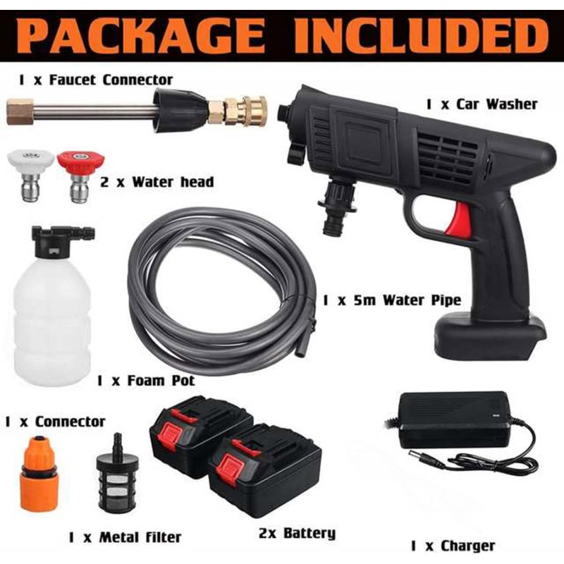 Inclui1 x sistema de lavagem de carro. 1 conector para torneira./2 cabeças de água. 1 recipiente de espuma. 1 conector./1 filtro de metal./2 pilhas. 1 x 5 m de tubo de água./1 carregador. |