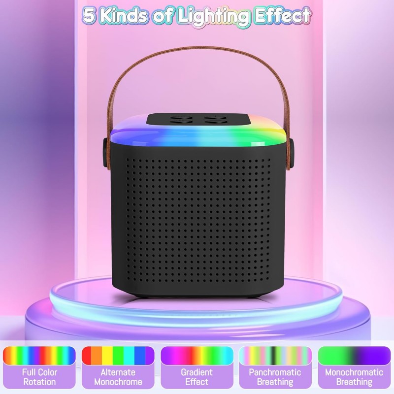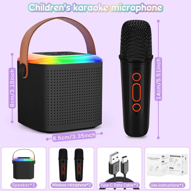 Conjunto de karaoke infantil com 2 microfones sem fios Bluetooth, altifalantes LED, efeitos sonoros e iluminação RGB. Portátil e compatível com dispositivos iOS e Android.