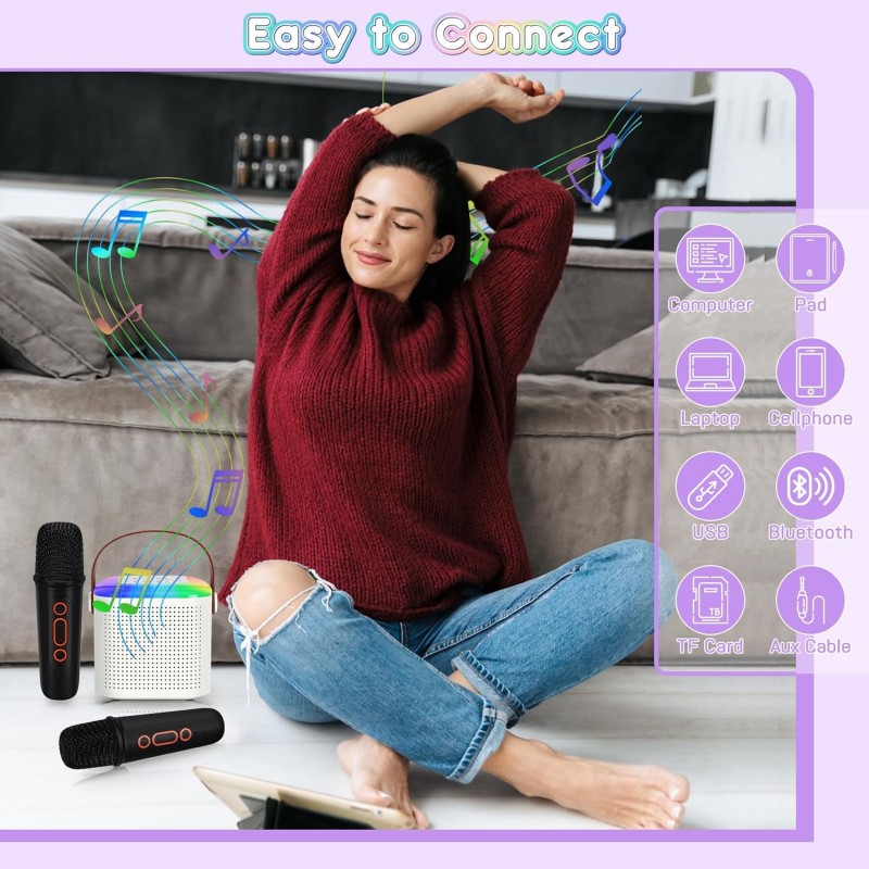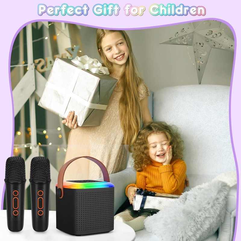 Transforme qualquer momento numa festa com este conjunto de karaoke infantil equipado com 2 microfones sem fios Bluetooth e altifalantes LED. Compacto e portátil, é perfeito para crianças em eventos familiares, festas e viagens, proporcionando diversão garantida.
