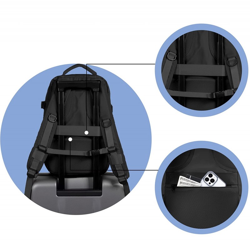 Se você precisar de espaço adicional, as alças na parte traseira da mochila permitem que você prenda a mochila à alça de uma mala, facilitando o transporte.