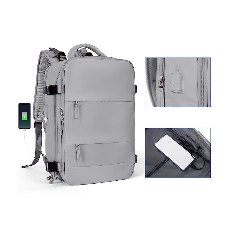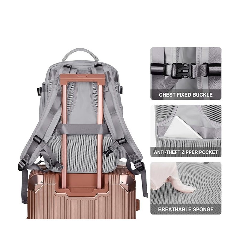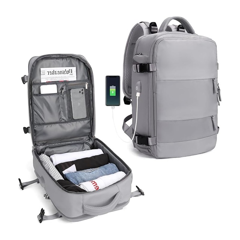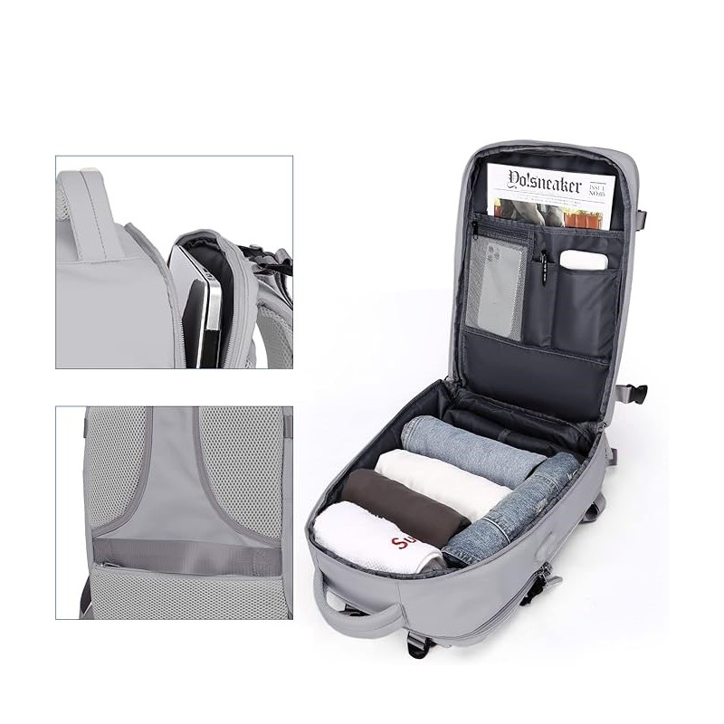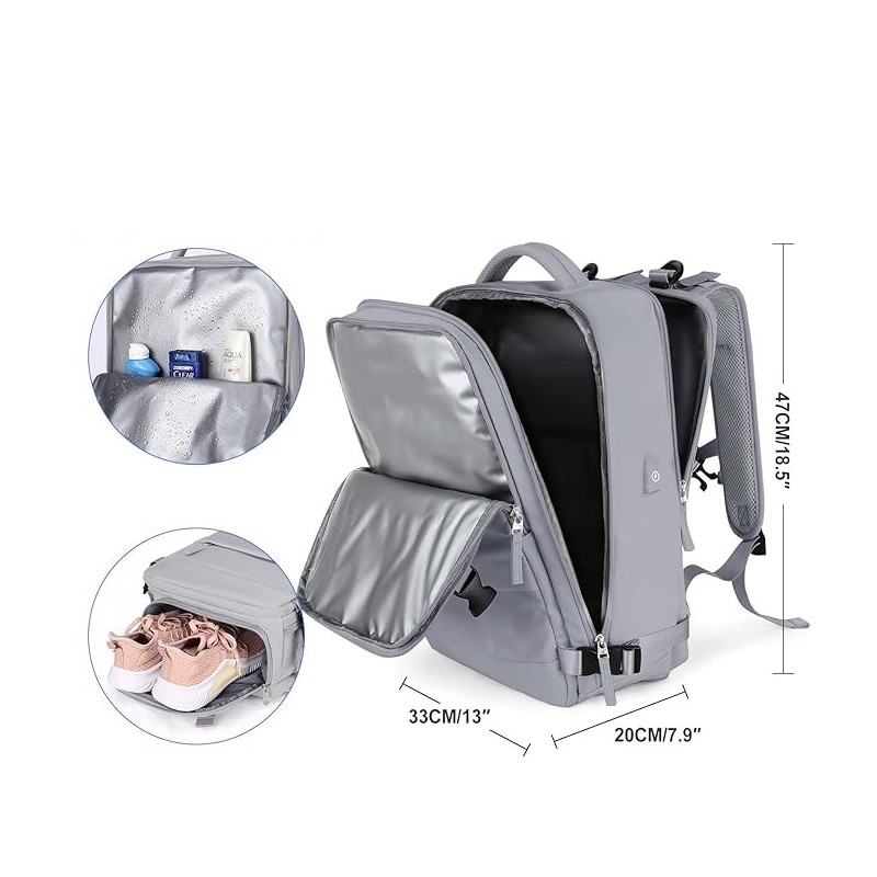Compartimentos Inteligentes: Equipada com múltiplos bolsos, incluindo dois compartimentos principais e dois específicos para dispositivos eletrónicos de até 14 polegadas, esta mochila organiza eficazmente os seus itens. A inclusão de um compartimento separado para sapatos e uma bolsa húmida de material impermeável maximiza a organização e higiene dos seus pertences.
