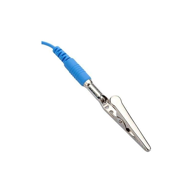 Pulseira antiestática ajustável com cabo de aterramento, ideal para proteger equipamentos sensíveis a choques elétricos. Inclui resistência de 1 mega Ohm para segurança adicional.